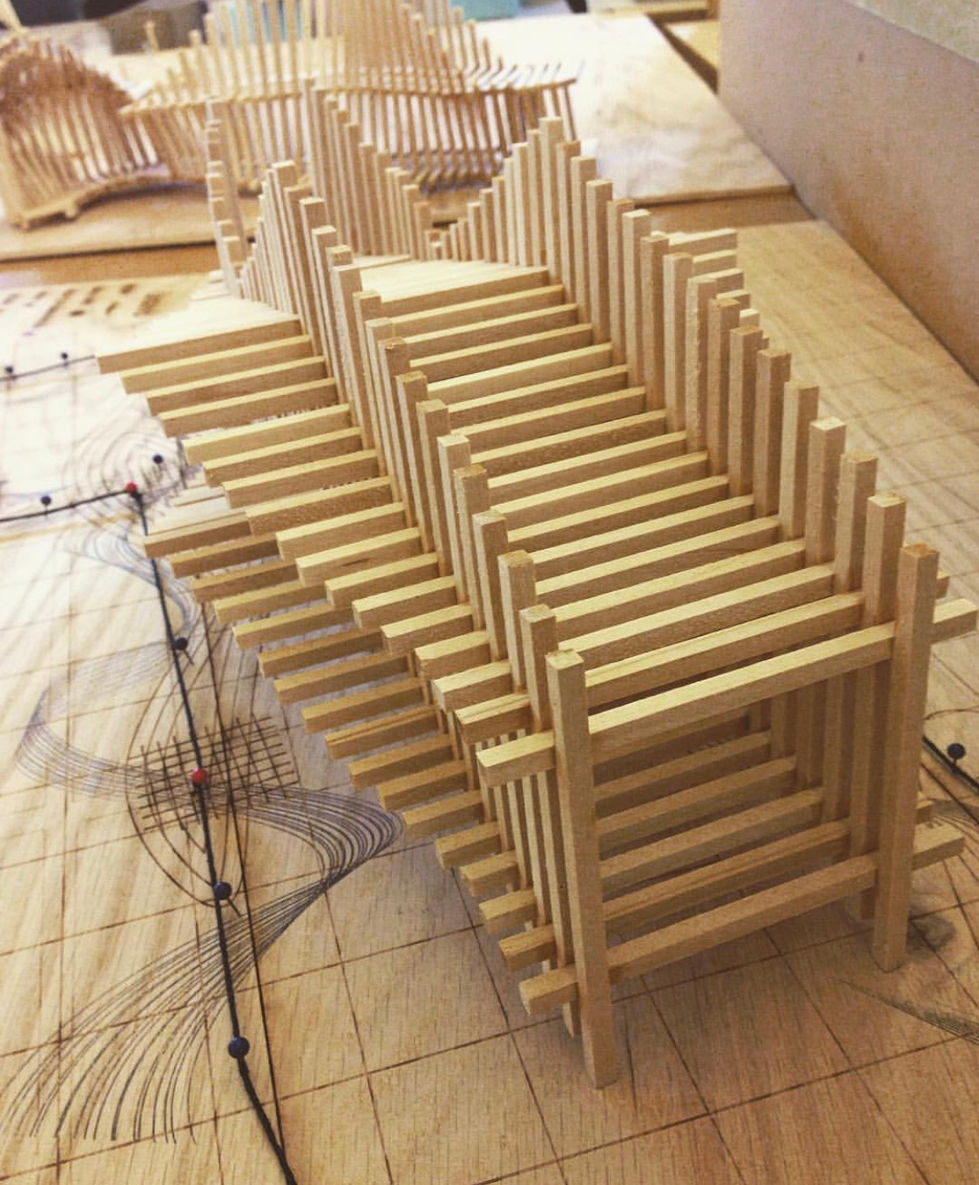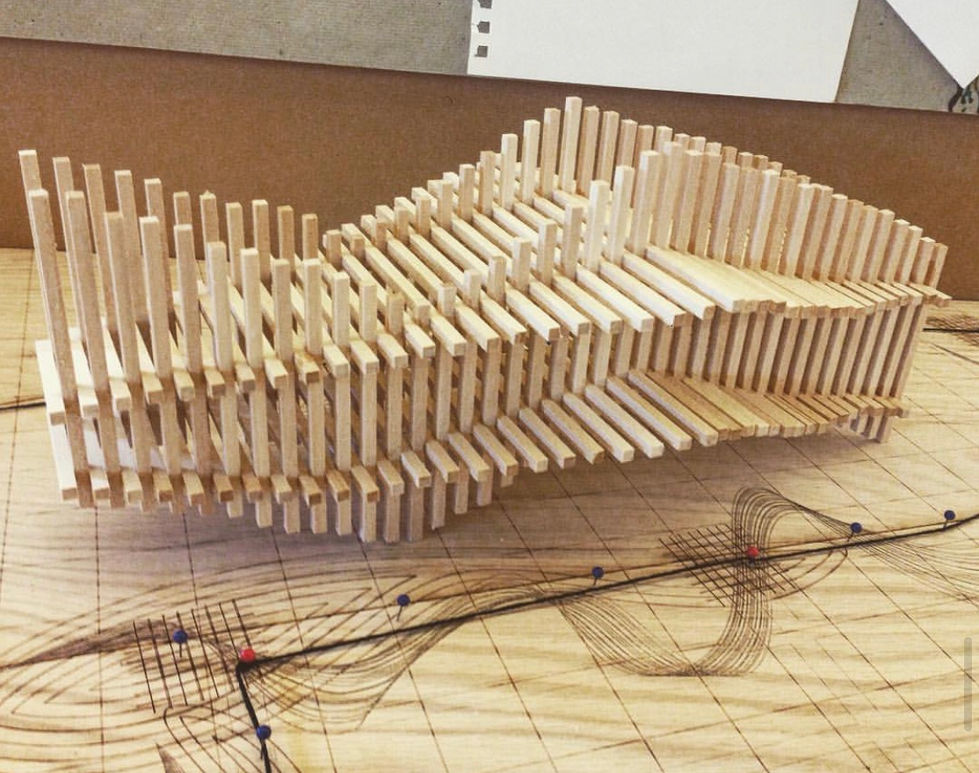 This tectonic model explores the relationship between form, structure, and spatial flow through a series of repetitive linear wooden elements. By layering and rotating these elements along a controlled path, the design creates a fluid, wave-like geometry that mimics natural topographies and tectonic shifts. The base grid, combined with string and point-mapping, serves as a parametric framework guiding the transformation of space from flat surface to three-dimensional form. The project emphasizes the interplay between order and movement, demonstrating how systematic rules can generate organic, dynamic structures. It represents an early-stage conceptual investigation into tectonics, materiality, and architectural morphology.